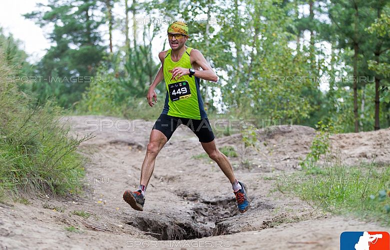 На фото от sport-images - спуск на заключительном км круга. Кстати, что касается трассы: на круг 11 км реально трейловый кусок - песчаный карьер с небольшими, но "вставляющими" горочками, - приходился лишь на последние 2.5 км (первые 8.5 - вполне себе приятная лесная тропинка, на которой можно было просто отдыхать и наслаждаться жизнью). Уже со 2-го круга приходилось заходить в них пешком. А в одном месте была такая конкретная ступенька аж по грудь, что орги предусмотрительно поставили туда своего качка-вытолчка, который вытаскивал-выдергивал-выталкивал участников наверх. Без него справиться было бы ну оч. проблематично, особенно на 2 и 3 круге! А герою впору памятник ставить - это ж он поупражнялся 380+270=больше 600 таких выдергиваний в теч. 4-5 часов! Интересно, как у него плечо чувствовало опосля...